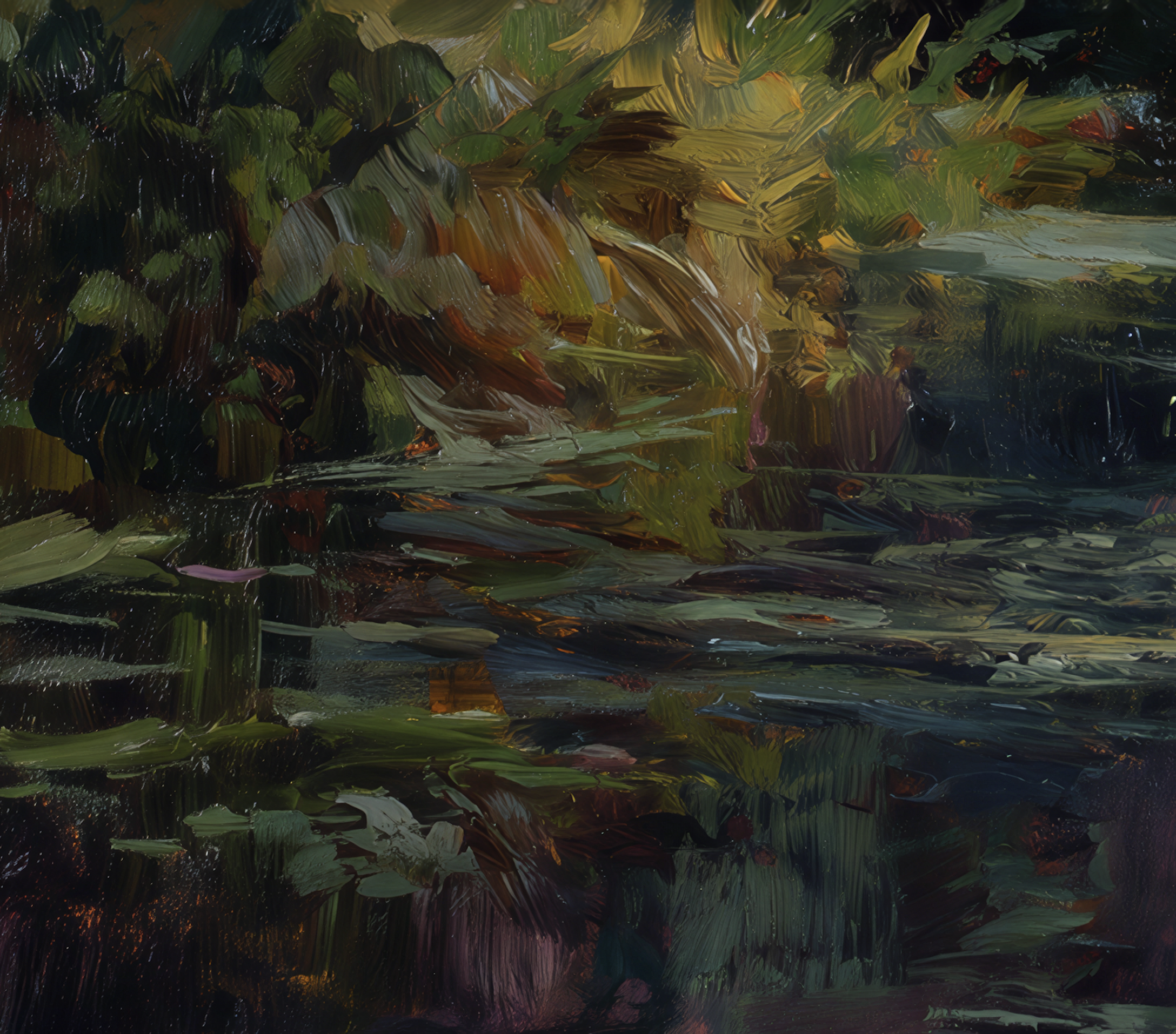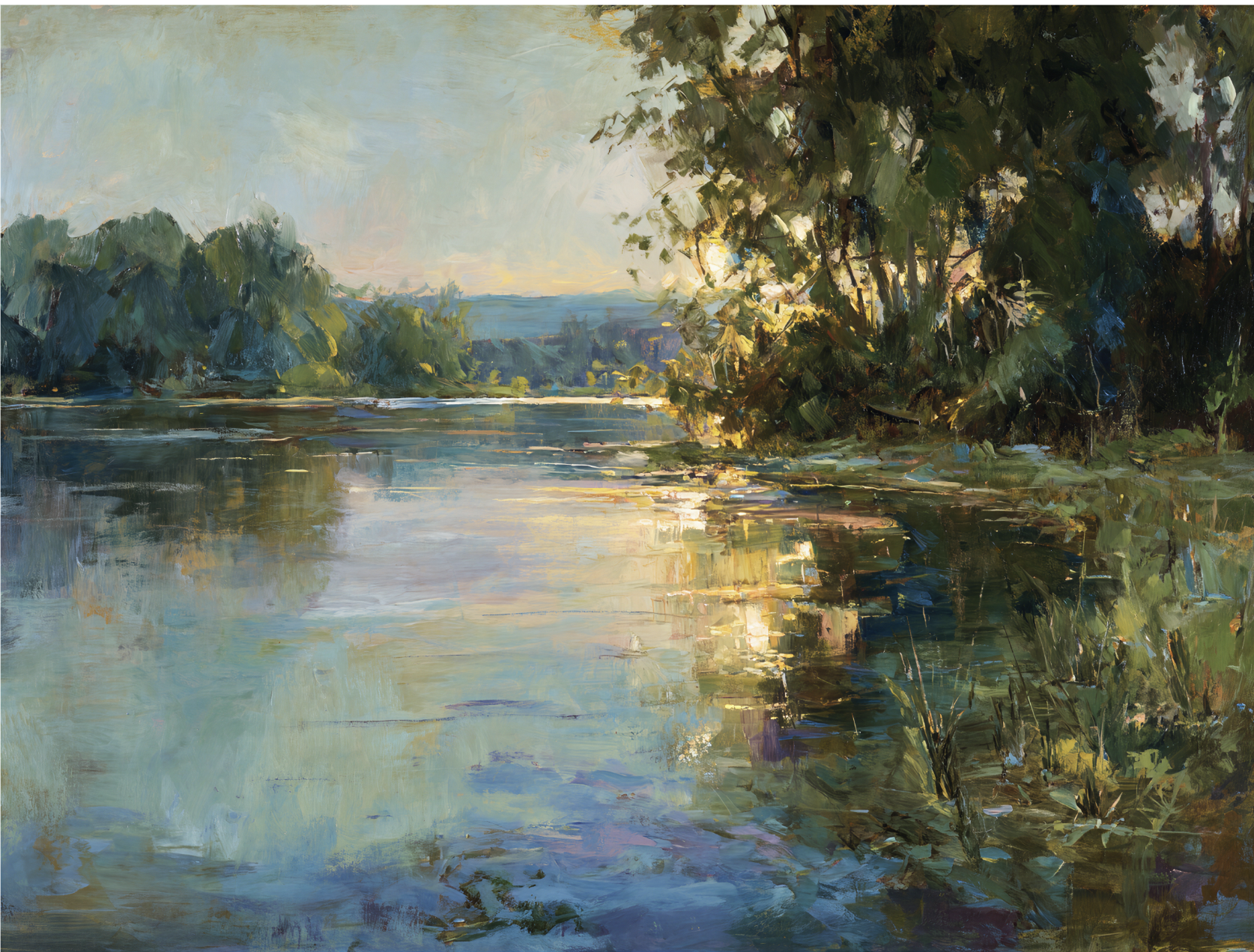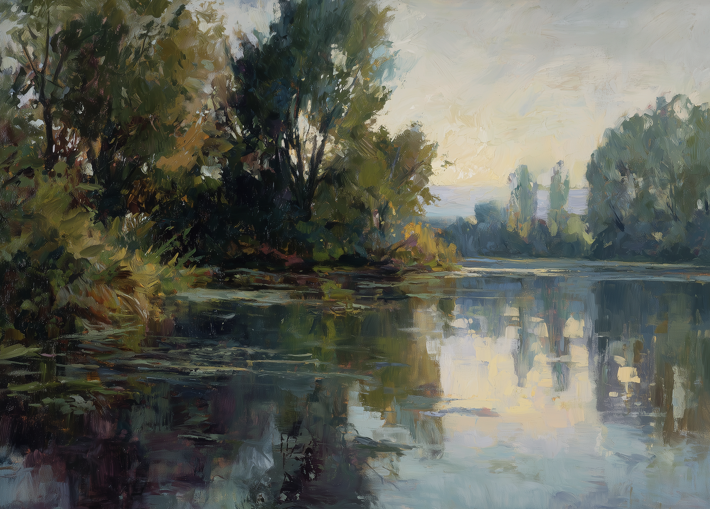 Some move closer to the bank, where the light catches in grasses and along uneven edges, breaking into smaller pieces. Others stay out in open water, where the color spreads and blends until it’s hard to tell what’s reflection and what’s coming from above. And in a few, there are those quieter tones—lilac, muted blues, soft greens—that don’t show themselves right away, but sit there once you start looking.