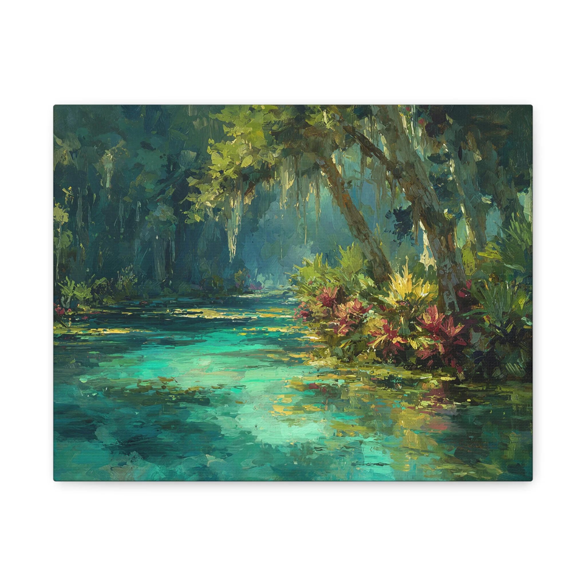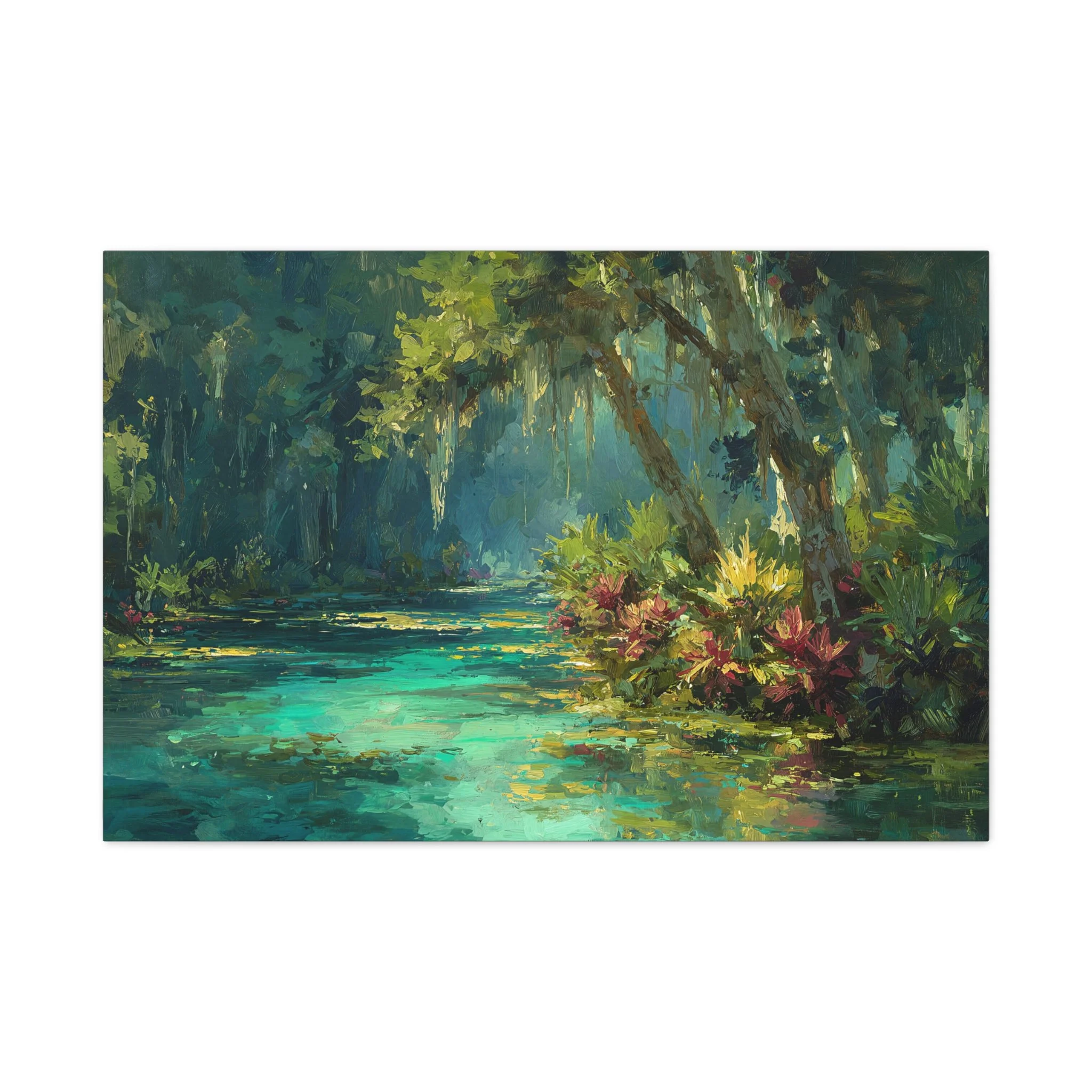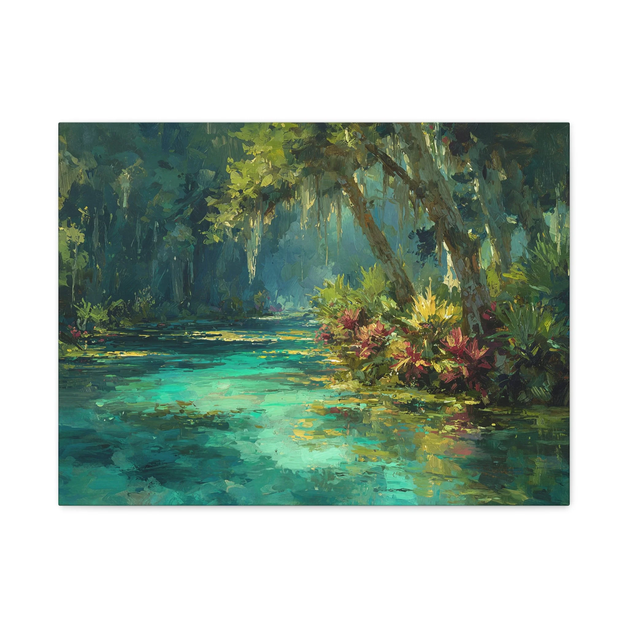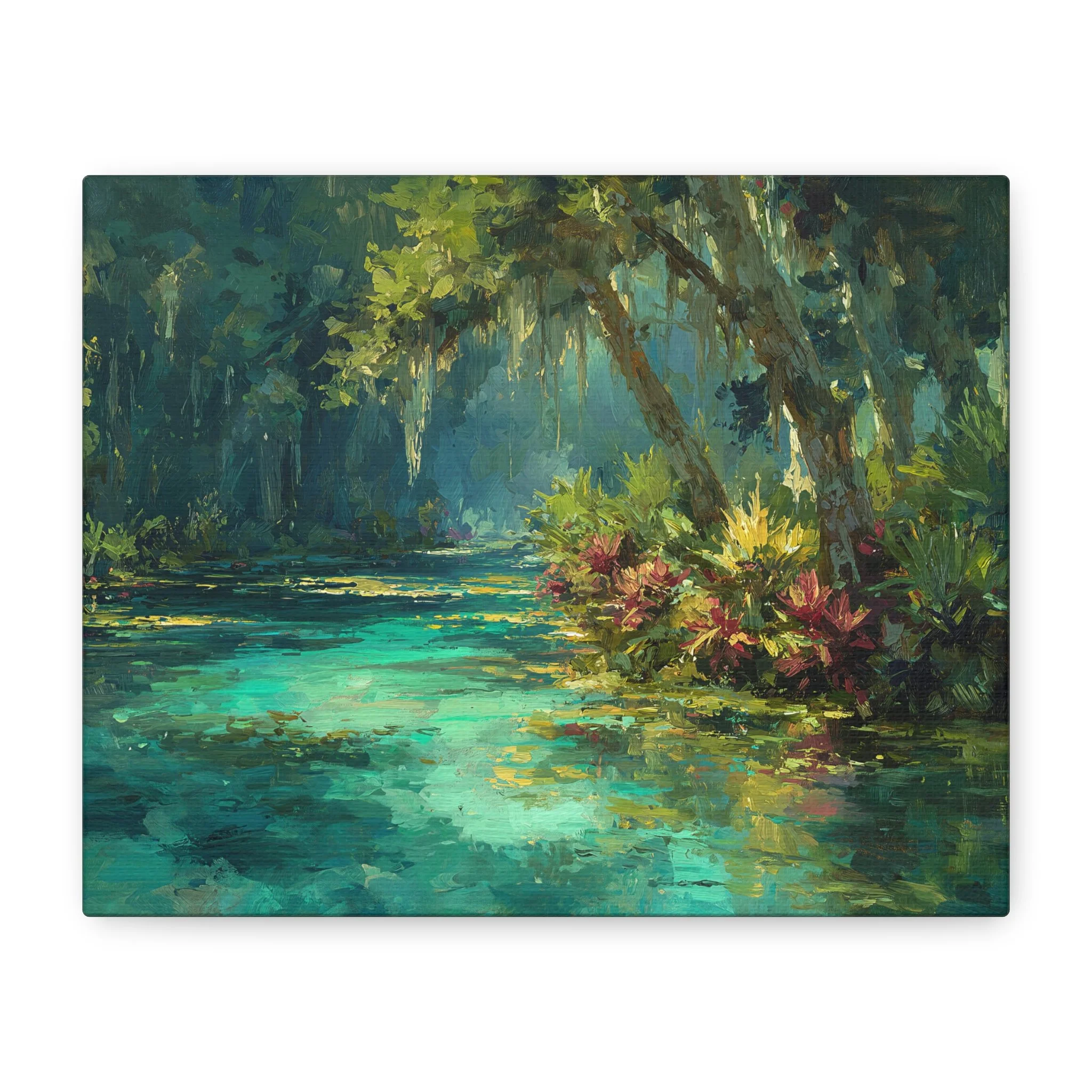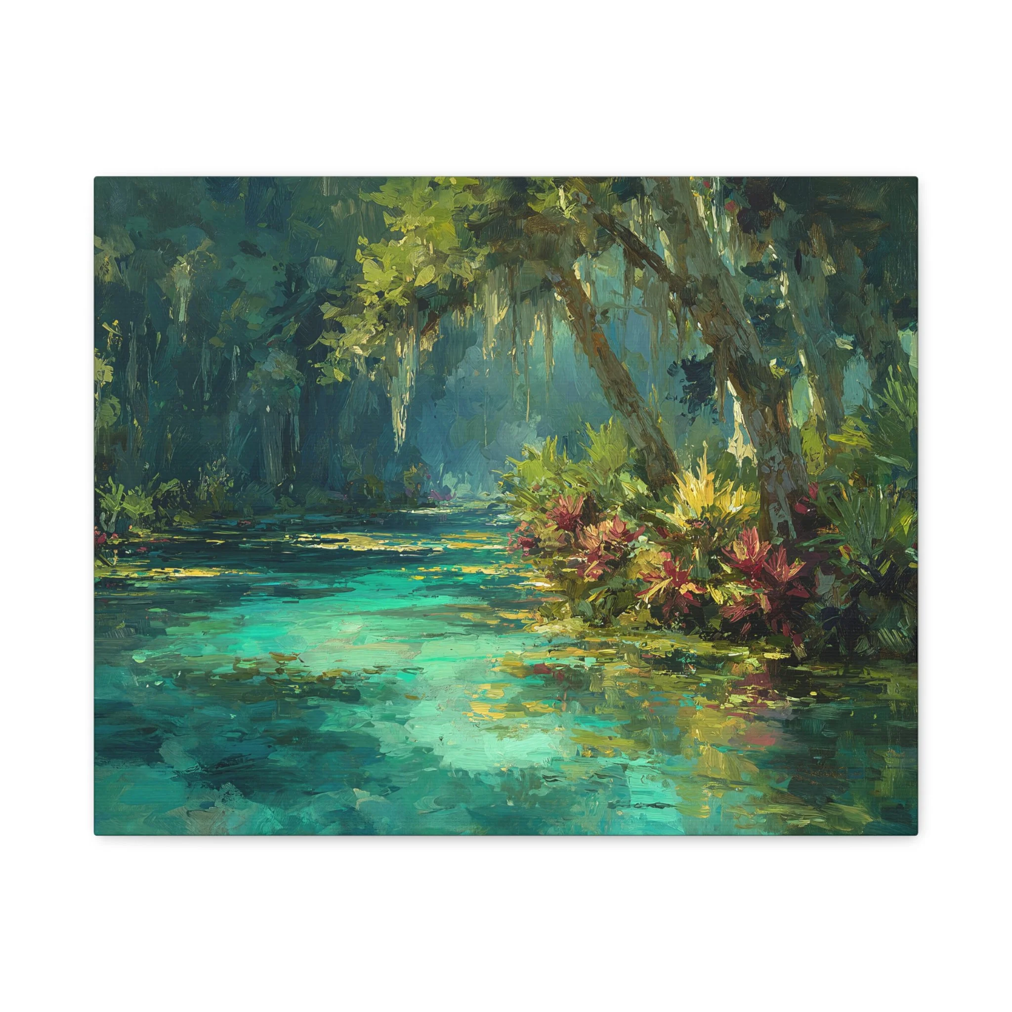 Clear spring water bends around sand and live oaks draped in Spanish moss. Turquoise runs through the center, picking up deep greens and flashes of pink from the foliage. You can see into the water and across it at the same time—nothing sits still, everything shifts.