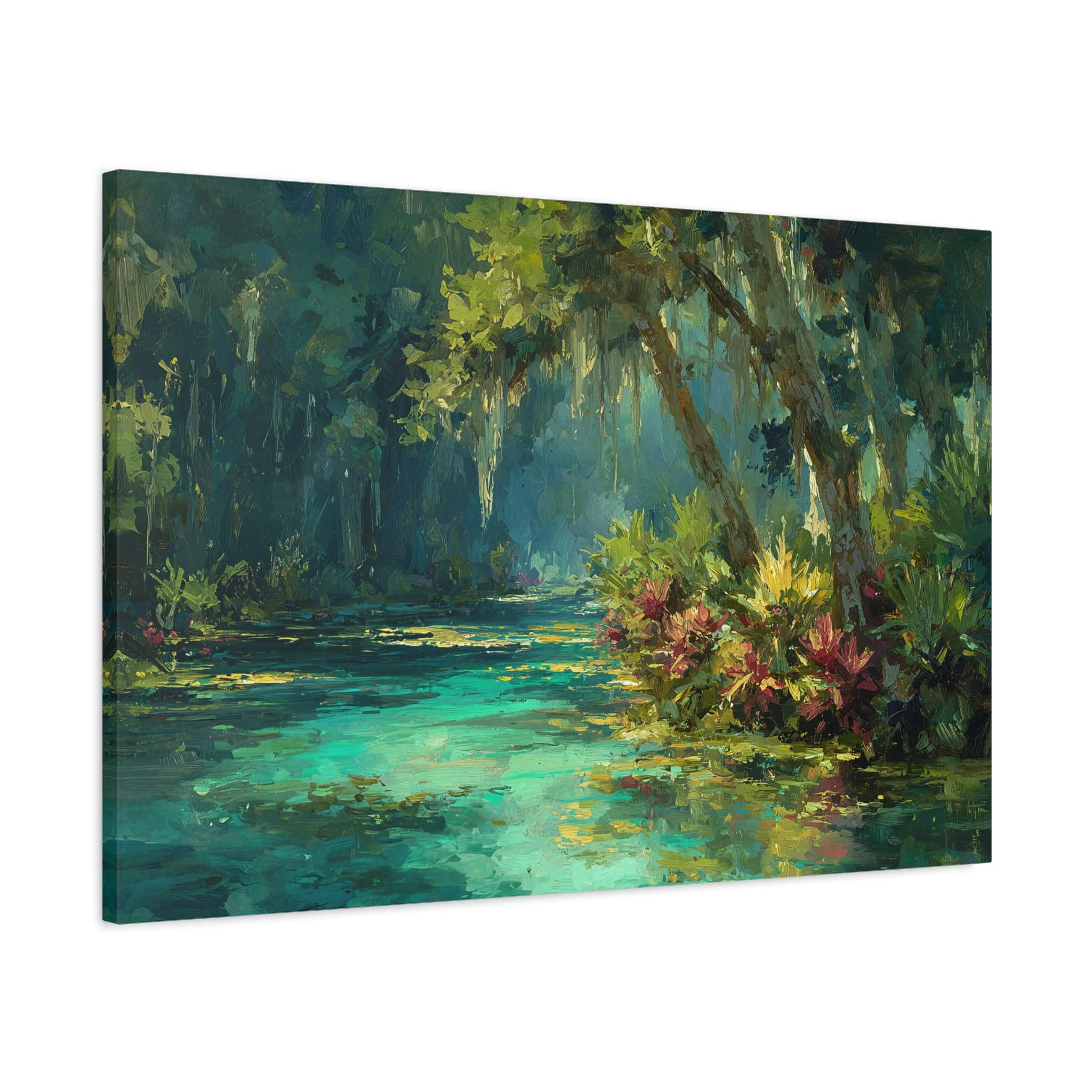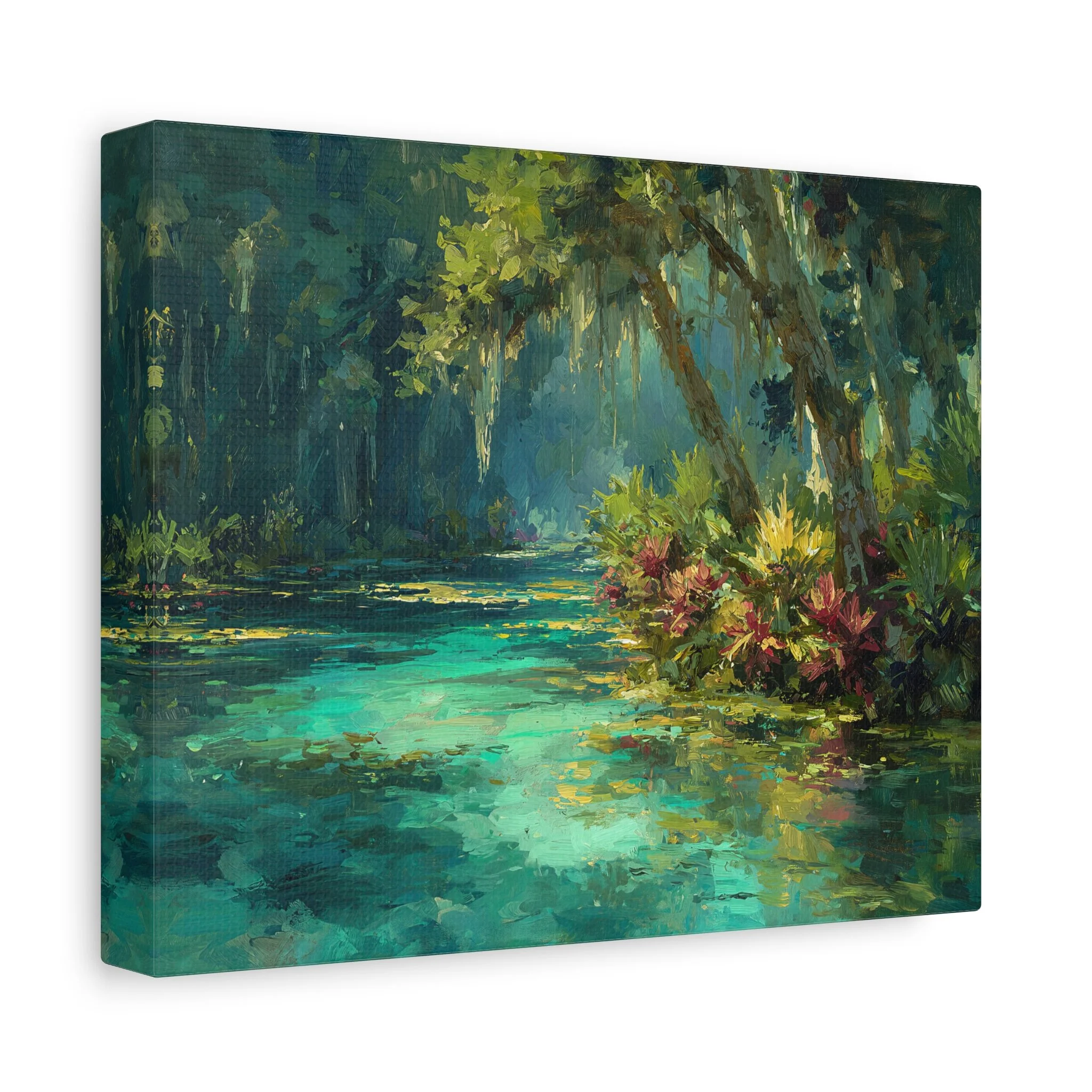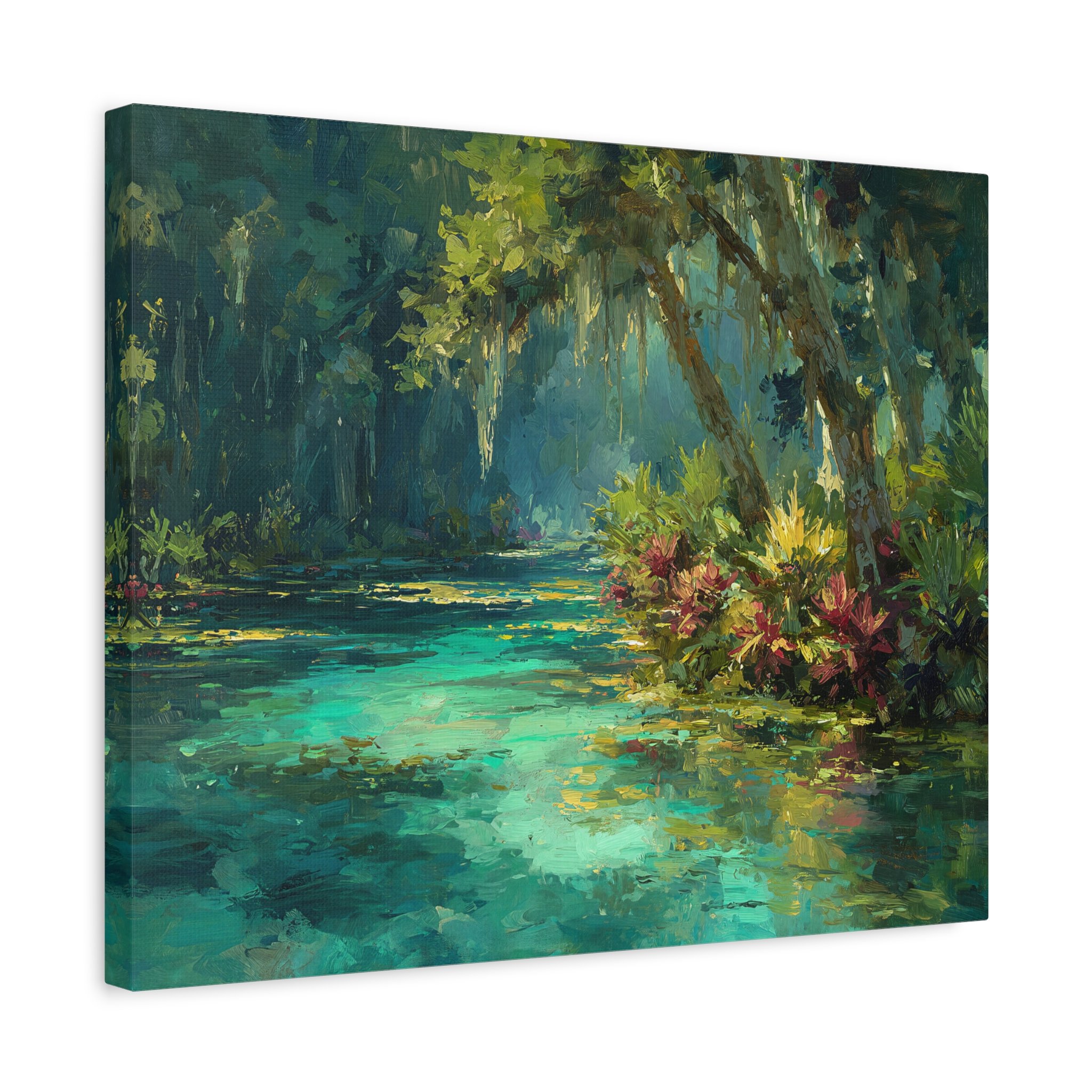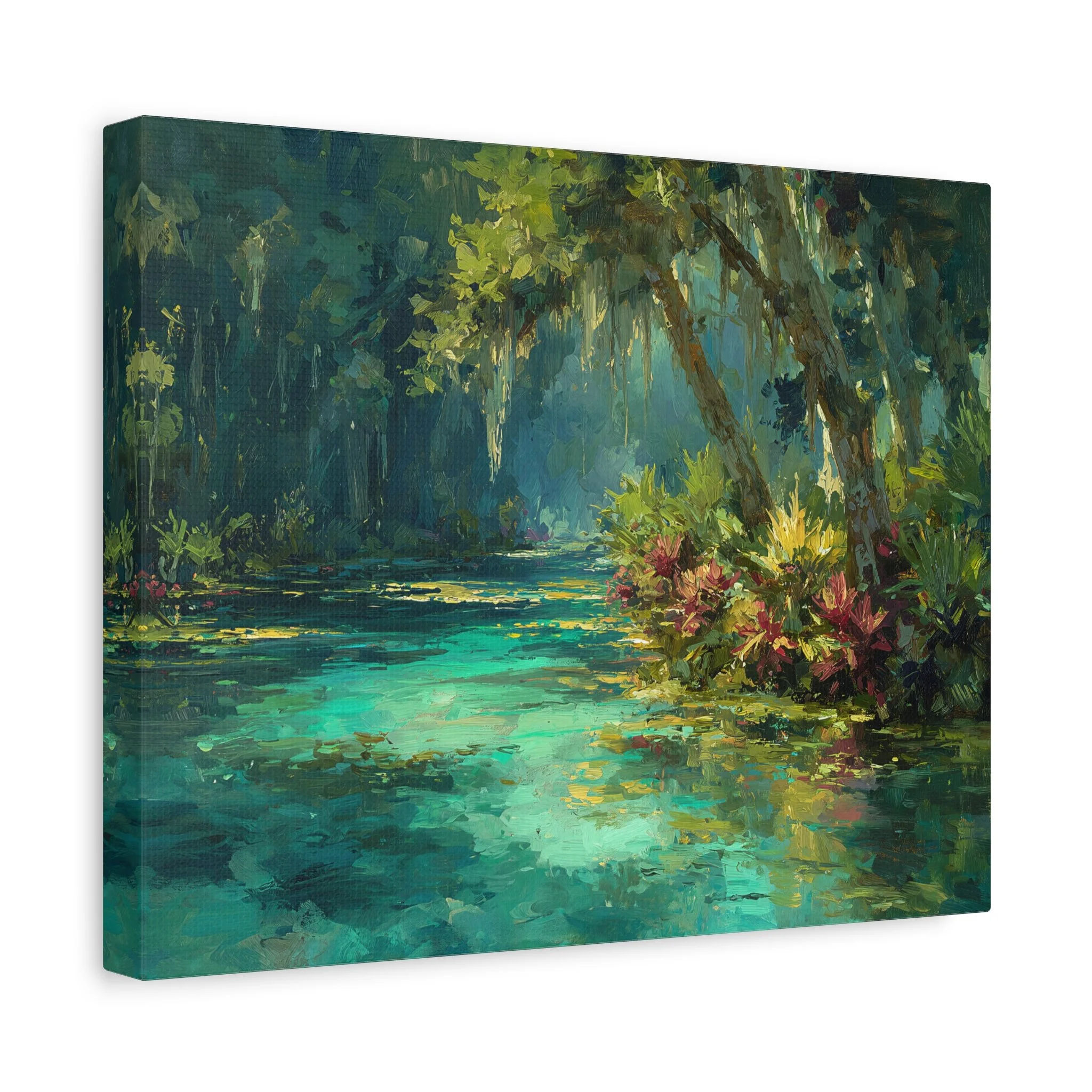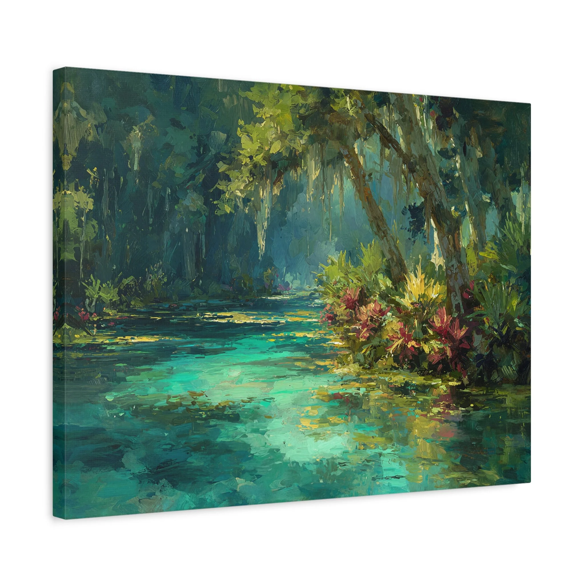 Clear spring water bends around sand and live oaks draped in Spanish moss. Turquoise runs through the center, picking up deep greens and flashes of pink from the foliage. You can see into the water and across it at the same time—nothing sits still, everything shifts.